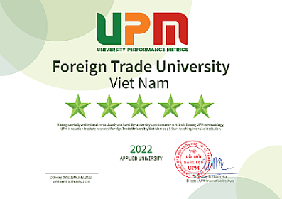 Trường Đại học Ngoại thương được xếp hạng 5 sao theo hệ thống University Performance Metrics (UPM), ghi nhận năng lực toàn diện của Nhà trường trong đào tạo, nghiên cứu khoa học và phục vụ cộng đồng.
