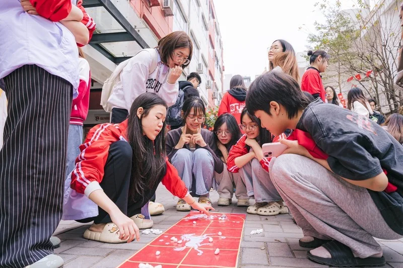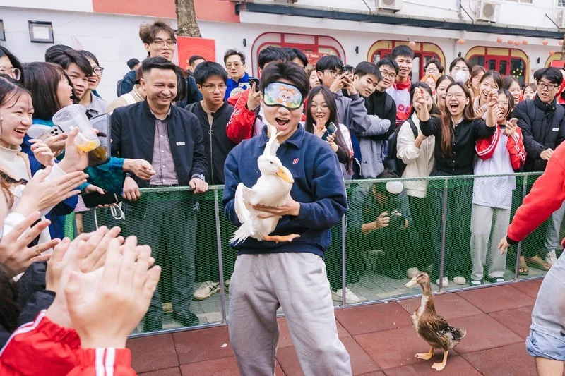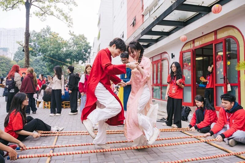 Bên cạnh các hoạt động trải nghiệm, sân trường còn “nóng” lên bởi loạt trò chơi dân gian như cờ Tết, ô ăn quan, nhảy sạp, đi cà kheo, đẩy gậy. Đặc biệt, trò “bịt mắt bắt vịt” tạo nên tâm điểm náo nhiệt với tiếng reo hò cổ vũ vang khắp khu vực, biến sân trường thành không gian hội xuân đúng nghĩa. Theo quan niệm dân gian, phần thưởng bắt được mang ý nghĩa may mắn, “lộc” đầu năm, càng làm không khí thêm hào hứng.