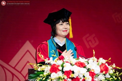 Cô tin rằng với 6 giá trị cốt lõi bao gồm sáng tạo và xuất sắc, bản lĩnh và trách nhiệm, đa dạng và hoà hợp, mà mỗi người Ngoại Thương chúng ta đã cố gắng bồi đắp trong suốt quá trình học tập tại Trường cũng như trong quá trình trưởng thành sau này, các em sẽ đủ tự tin và đủ nhiệt huyết, đủ mạnh mẽ và đủ dẻo dai, đủ khiêm nhường và đủ cầu thị, đủ trách nhiệm và đủ nhân ái để dấn thân, để từng bước đạt được những dấu mốc đáng tự hào trong cuộc đời của mình. Và cô cũng tin rằng rất nhiều người Ngoại thương trong khán phòng ngày hôm nay sẽ ghi dấu ấn đặc biệt của mình trong tương lai, và chắc chắn các em sẽ có một hành trình trưởng thành đáng tự hào và hạnh phúc.