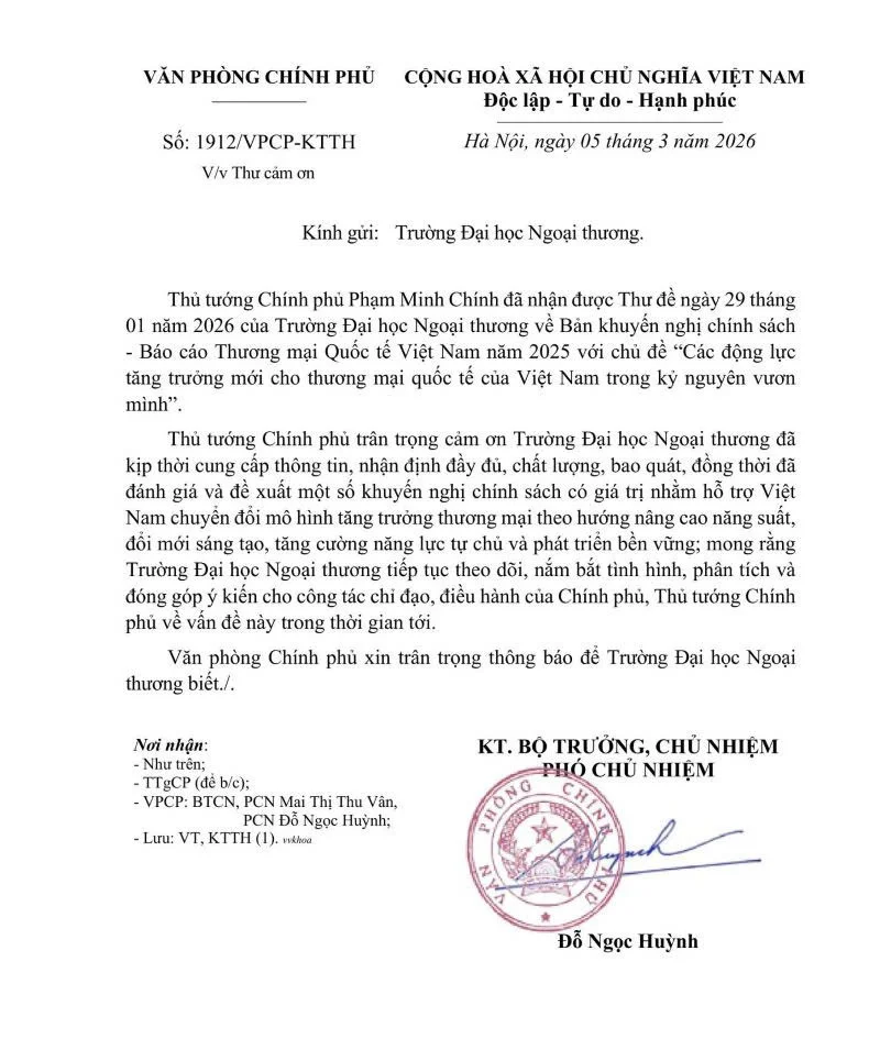Ngày 05/3/2026, Văn phòng Chính phủ đã gửi Thư cảm ơn tới Trường Đại học Ngoại thương về Báo cáo Thương mại quốc tế Việt Nam năm 2025.